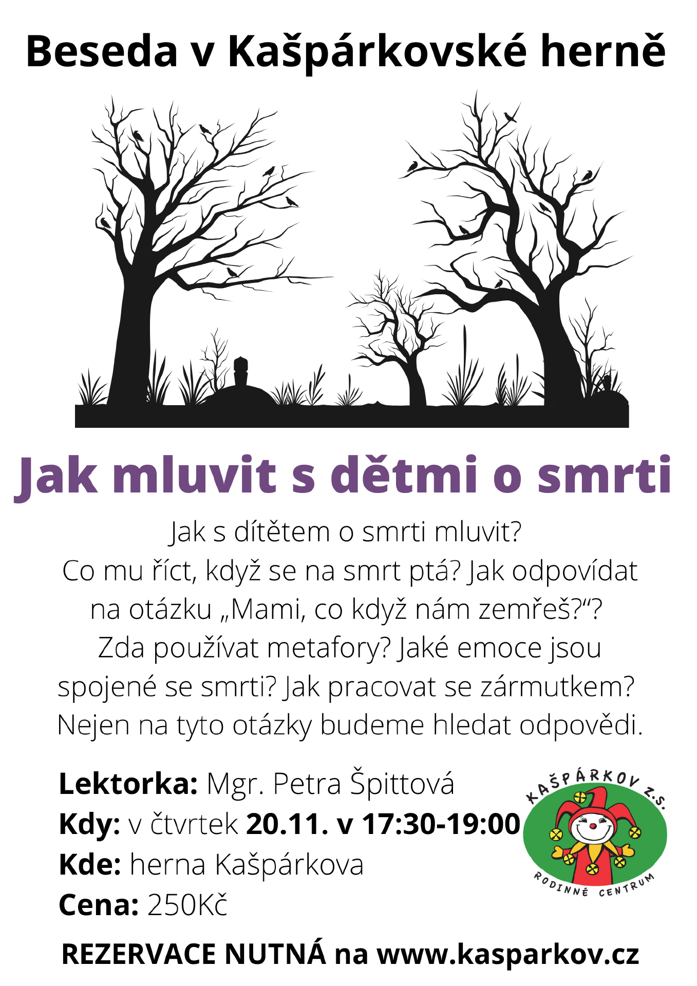 Mají vaše děti zvídavé otázky a vy se v tématu smrti necítíte jistě? Nebo mají velký strach a nedá jim to spát? Zveme vás na besedu, kterou si pro nás připravila průvodkyně umírajících a pozůstalých, učitelka ve školce Petra Špittová