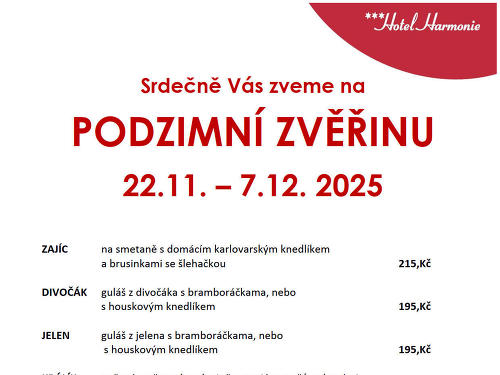 Milí hosté, přijďte ochutnat, co si běžně doma neuděláte. Srdečně vás zveme na podzimní zvěřinovou nabídku. Začínáme od soboty 22.11. až do neděle 7.12. 2025.