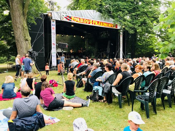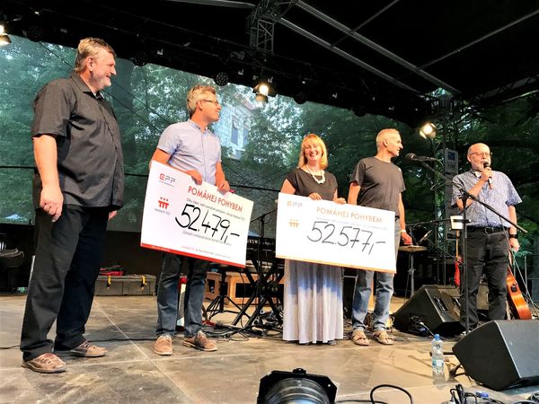 Slavnostní předání symbolických šeků na vyšlapané částky proběhlo před koncertem skupiny Javory na hlavním pódiu (zleva starosta města Náměšť Vladimír Měrka, ředitel ZUŠ Náměšť Martin Beneš, ředitelka Domova bez zámku Hana Šeráková, ředitel EDU Miloš Štěpanovský a moderátor Jiří Hejl, zvaný Ďoubal). Foto: Nadace ČEZ