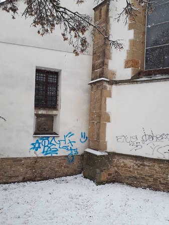Policisté pátrají po vandalovi, který v Rosicích posprejoval zeď kostela