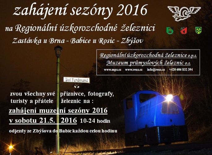 Muzeum průmyslových železnic o.s. a Regionální úzkorozchodná železnice o.p.s. Vás zve na zahájení 10. sezóny Regionální úzkorozchodné železnice o.p.s. a provozu historických vlaků na trati Zbýšov - Babice u Rosic - Zastávka u Brna. Jde o bývalou uhelnou vlečku z roku 1862, kterou naše obecně prospěšná společnost spolu s přispěním zmíněných obcí v okolí dráhy, Jihomoravského kraje i jiných partnerů z komerční sféry (ČEZ, Veletrhy Brno, Siemens) přestavuje na muzejní železnici s provozem historických, zvláště parních vlaků v turistické sezóně. Vozidla úzkorozchodných železnic mnohdy svými kompaktními rozměry a líbivým vzhledem připomínají model či hračku, přesto jde o desítky (a v případě elektrické lokomotivy Siemens už 106 ) let staré stroje trávící svůj život v lomech, dolech, cihelnách, železárnách, tedy objektech vesměs veřejně nepřístupných. Což činí zvláštní poezii těchto malých vláčků ještě zajímavější. Akce proběhne v sobotu 21. 5. 2016 od 10:00. Odjezdy ze Zbýšova do Babic se uskuteční každou hodinu.